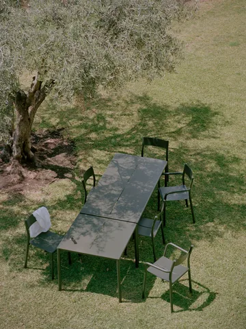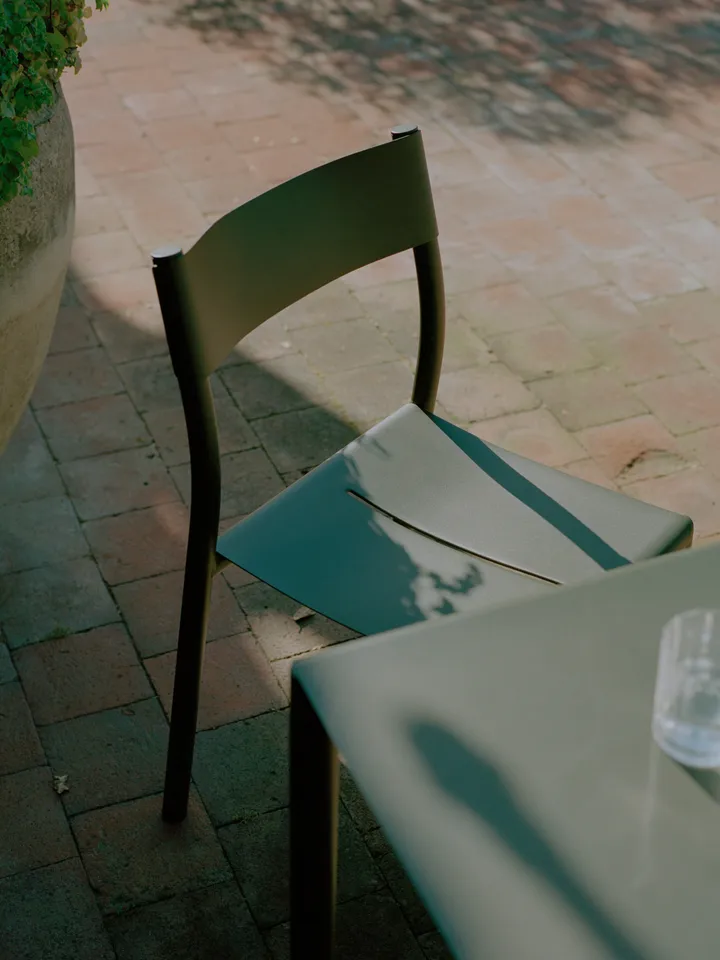 May Chair Outdoor stol er en del av May-serien, designet av Hannes & Fritz. Laget i pulverlakkert stål, er denne robuste stolen perfekt for hage, uteplass eller balkong. Stolen er stablebar og har et diskret monokromatisk utseende. Setet, som er lett buet, omslutter kroppen behagelig og en spalte i setet gjør det mulig for vann å renne bort.