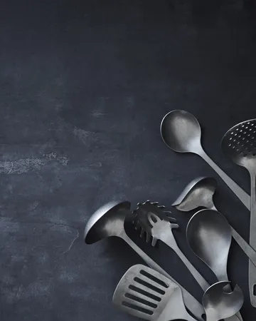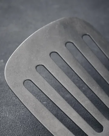 Nicolas Vahé Daily stekespade rustfritt stål har et industrielt design og er en slisset spatel med hull. Spatelens design gjør det lettere å gli under biffer, stekte egg eller fisk, og hullene sørger for at overflødig olje og fett ikke følger med.