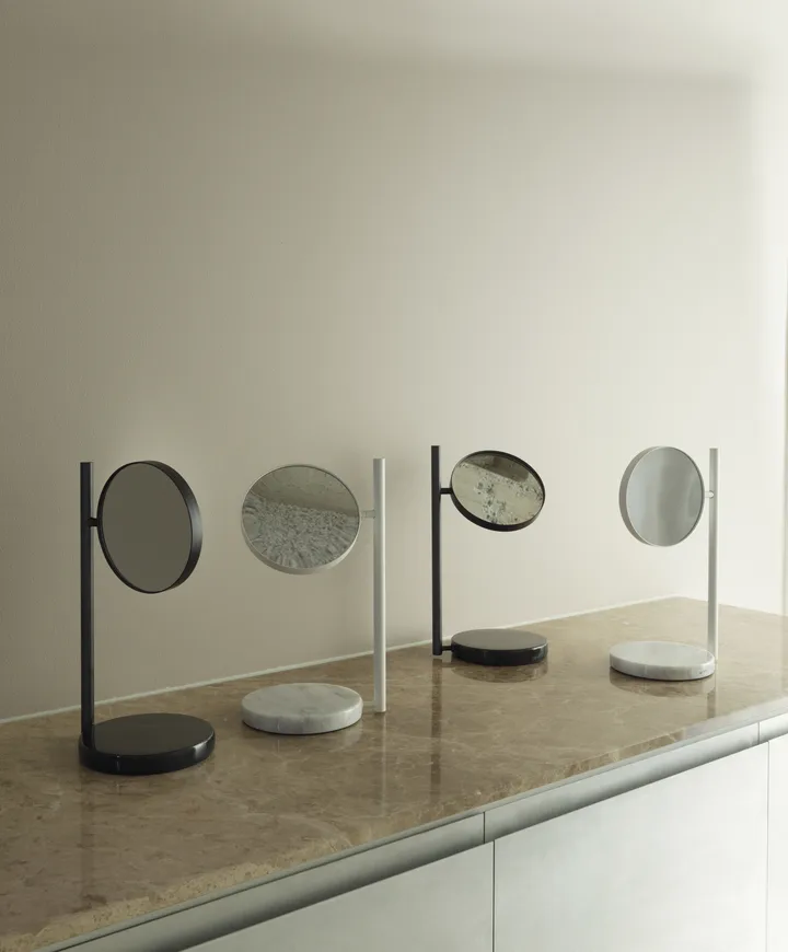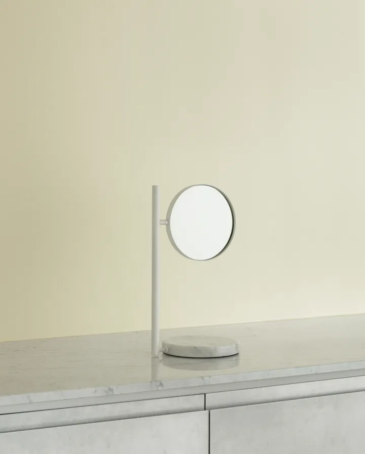 Pose dobbeltsidig bordspeil fra Normann Copenhagen er et nedtonet og minimalistisk bordspeil med marmorfot, som også kan brukes som avlastningsflate for for eksempel klokken eller smykkene dine. Hvert speil er helt unikt fordi marmor er et naturmateriale som varierer i utseende. Selve speilet er dobbeltsidig med vanlig speilglass på den ene siden og forstørrelsesglass (x3) på den andre siden.