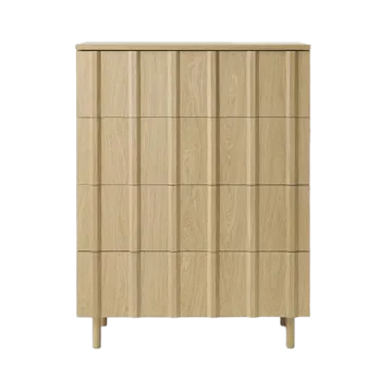 Rib kommode 4 skuffer fra Normann Copenhagen er laget av lakkert eikefinér og massivt tre. Inspirert av skandinavisk design fra 1960-tallets nordiske sommerhus, har Rib-kolleksjonen trapezformede trepaneler som gir en tidløs og karakterfull estetikk. Rib kommode fås i eik eller myk svart finish og kombinerer holdbarhet med en minimalistisk og naturlig stil. Bruk den på soverommet for å organisere klær og tilbehør, eller i gangen som en elegant og praktisk oppbevaringsløsning.