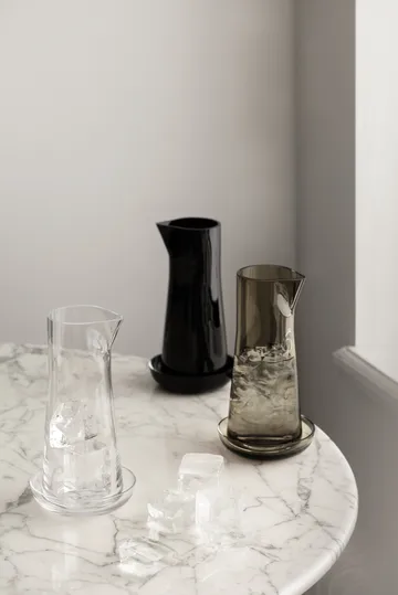 Informal karaffel med skål 1 L fra Orrefors har en høy kropp av glass med en fremtredende helletut og kommer sammen med en liten skål. Skålen kan brukes både som underlag for karaffelen eller som et separat serveringsfat for små snacks og tilbehør. Den elegante karaffelen og skålen inngår i Informal-serien som er designet av Björn Dahlström.