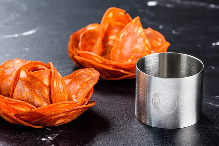 Plate-it garnityrformer 4 stk fra Plate It er laget av rustfritt stål og er perfekte for å skape pene og jevne porsjoner på tallerkenen. Bruk dem til å forme bifftartar, risotto eller puréer. Med hjelp av pusheren presser du enkelt ut fyllet fra formen. Et tips er å stemple en dråpe saus med pusheren for en ekstra dekorativ touch.