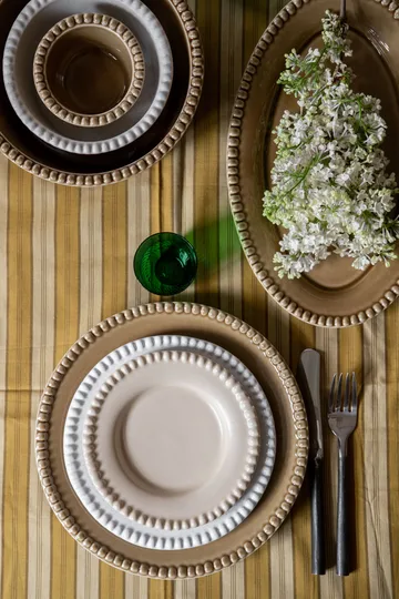 Daria serveringsfat fra svenske PotteryJo passer perfekt som serveringsfat til middagsinvitasjonen. PotteryJos grunnlegger Johanna Hampf står bak designet av hele Daria-serien, og hennes inspirasjon kommer fra det planteriket. Fatet har en vakker detaljert kant som gir det et unikt utseende, som passer like godt til hverdags som til fest.