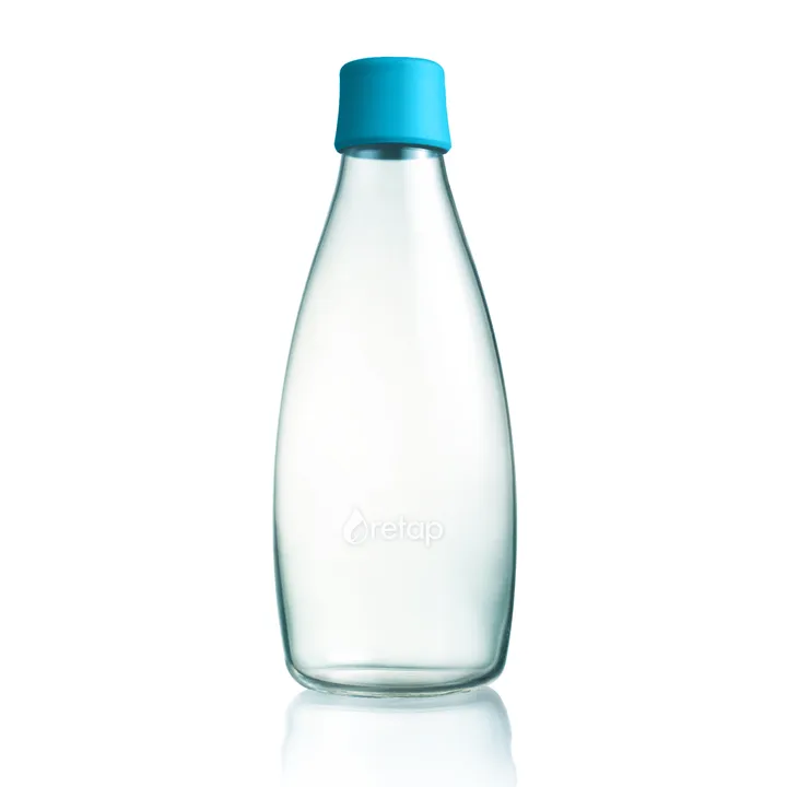 Den smarte Retap-flasken i glass med tilhørende kork fins i flere fine farger. Flasken produseres som et mer miljøvennlig alternativ til den tradisjonelle PET-flasken. Bruk flasken som en karaffel på det dekkede bordet og fyll den med vann fra springen. Lokket på Retap stenges med et enkelt trykk og er forseglet når du hører en klikkende lyd.