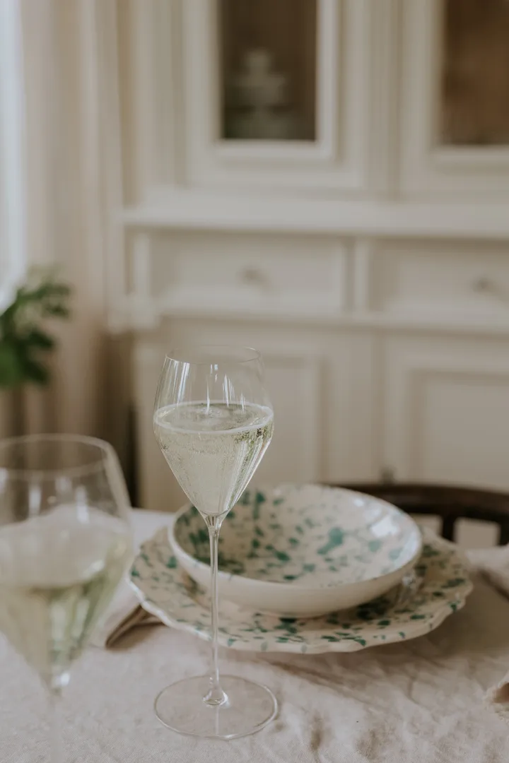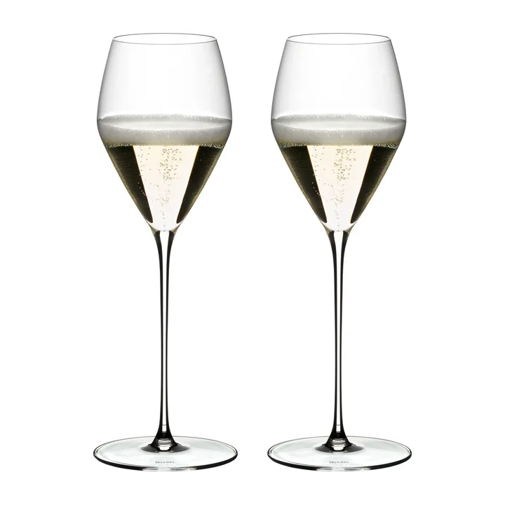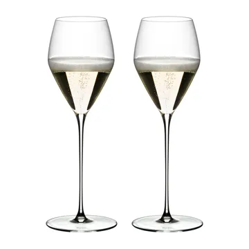 Riedel Veloce champagneglass 2-pakke består av to krystallglass, hvor hver har en spiss kupp nederst, en generøs midtdel og en avsmalnet åpning. Formen på glasset gjør at det dannes en strøm av bobler fra champagnen og at aromaene konsentreres når du lukter på den. Champagneglassets smale åpning styrer drikken til fremre del av tungen og gjør opplevelsen av sødmen større.