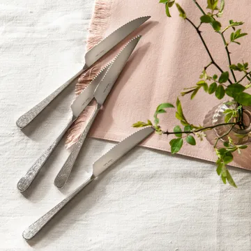 Skye Bright grillkniv fra Robert Welch er en elegant biffkniv med et mykt avrundet skaft og en vakker struktur som er inspirert av tradisjonelle sølvsmedteknikker. Eggen til kniven har ekstra kvasse tenner for enkelt å kunne skjære gjennom tykke kjøttbiter.