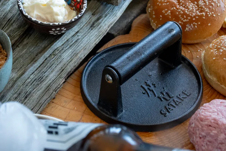 Satake burgerpresse er laget av støpejern og har håndtak av tre. Pressen kan brukes til kjøtt og hamburger og fordi den er helt flat på undersiden, er den perfekt for nettopp smashburgere. Satakes kjøttpresse er spesielt utviklet for å kunne brukes utendørs på grillen eller campingplassen, og det er selvfølgelig mulig å bruke den inne på kjøkkenet ditt.