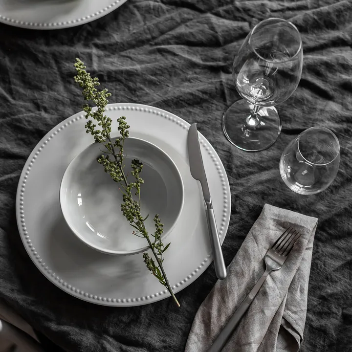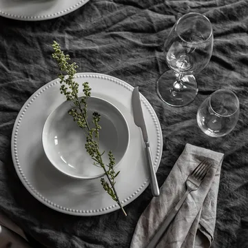 Tallerkenen Dots fra Scandi Living er en middagstallerken som er like velegnet til hverdagsbruk som til fest. Det dekorative hevede mønsteret strekker seg som et perlebånd rundt tallerkenens kant.