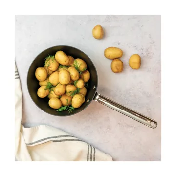 Scanpan TechnIQ Windsor kjele er resultatet av et unikt samarbeid med profesjonelle kokker og det perfekte redskapet for tilberedning av alle dine sauser. De høye og lett vinklede kantene fremskynder redusjonen og gir deg også plass til å komme ordentlig til når du trenger å vispe. Kjelen er laget av støpt aluminium og belagt med non-stick-belegget Stratanium+ som anses for å være markedets tøffeste! Den har en grovere tekstur som minner om en støpejernsgryte men tilbyr alle fordelene som et skikkelig non-stick-belegg gjør. Med denne kjelen får du en allsidig kasserolle som møter proffenes preferanser og tøffe krav!