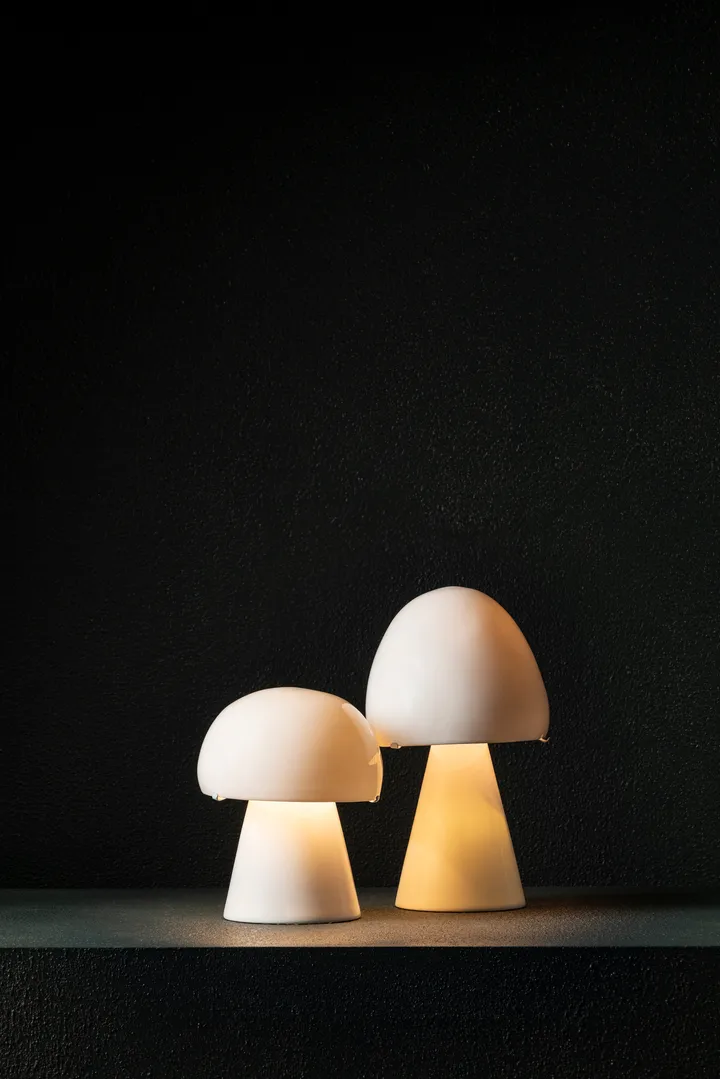 Terres De Rêves Joe bordlampe fra Serax er designet av Anita Le Grelle. Inspirert av 1960-tallets organiske sopplignende former gir denne lampen en nostalgisk og leken følelse. Laget av gjennomsiktig benporselen sprer den lys fra både basen og lampeskjermen, og gir stemningsfull belysning.