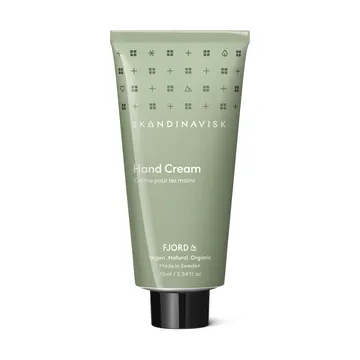 FJORD håndkrem fra Skandinavisk byr på duftnoter av eple- og pæreblomst, frukthager og røde rips. Med en vegansk og rikt fuktgivende formula som inneholder økologisk aloe vera samt svensk rapsolje, gir den næring og mykhet til tørr hud. Kremen består av 98% naturlige ingredienser og 60% økologisk sertifiserte ingredienser og er pakket i et resirkulert metallsqueeze-tube inspirert av de vestnorske fjordene.