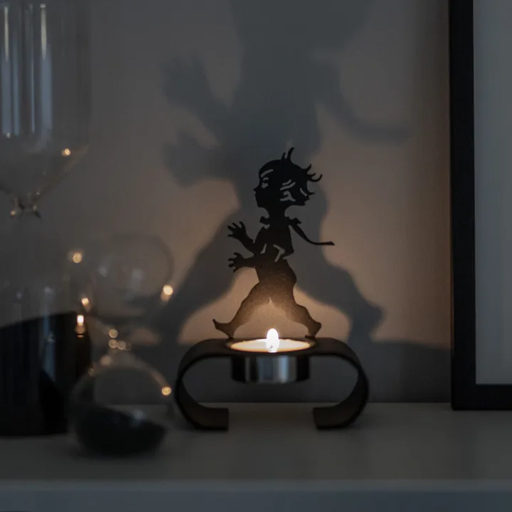 Silhuett telysholder 9,3 x 13,3 cm fra svenske Solstickan Design er en telysholder med motivet Solstickepojken, som ble designet av Einar Nerman i 1936. Plasser telysholderen på en benk eller hylle ved en vegg for å la motivet skape en effektfull skygge av guttens silhuett.