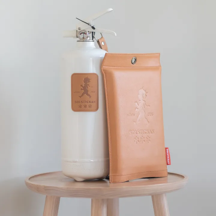 Solstickan brannteppe skinn 120 x 120 cm 2023 fra svenske Solstickan Design presenteres i et stilfullt skinnetui med preg av den klassiske Solstickepojken som ble designet av Einar Nerman i 1936 og redesignet 2023. Det anbefales at hvert hjem har røykvarsler, brannslukker og brannteppe som bør plasseres lett tilgjengelig i boligen.