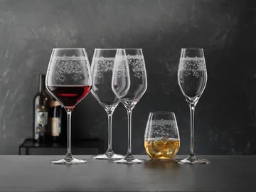 Arabesque hvitvinsglass 50 cl 2-pakning fra Spiegelau er to elegante hvitvinsglass i krystallglass med et vakkert slyngende blomstermønster og lav vekt. Kombiner gjerne disse vinglassene på fot med andre deler i Arabesque-serien for en helhetlig oppdekking.