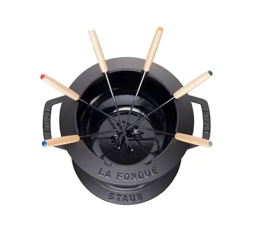 Staub fonduesett 2,35 l gjør det mulig å samles rundt bordet og nyte en skikkelig god fondue - den klassiske sveitsiske retten. Settet kommer fra franske Staub og inneholder gafler, brenner og en kvalitetsgryte i støpejern med emaljert overflate for ekstra beskyttelse. Grytens åpning er utformet med åtte heller for å gi god plass til de seks medfølgende gaflene i metall med trehåndtak. Med dette settet kan du servere gjestene både buljong-, ost- og sjokoladefondue.