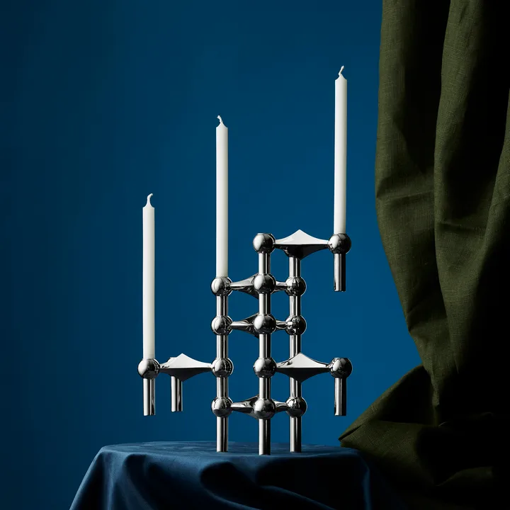 STOFF Nagel lysestake 3-pakning fra STOFF Copenhagen er et ikon innen moderne design, preget av skulpturell form og uendelige kombinasjonsmuligheter. Werner Stoff og Hans Nagel skapte den originale modellen på 1960-tallet, et samarbeid som kom til å definere en hel æra av dansk formgiving. Lysestakenes modulære konstruksjon gjør det mulig å bygge personlige formasjoner eller la hver del stå som et enkelt objekt. Den reflekterende metallen fanger lyset på en vakker måte og skaper en elegant atmosfære i rommet. STOFF Nagel lysestake 3-pakning fra STOFF Copenhagen er et tidløst designikon som forener historie, håndverk og kreativ frihet.