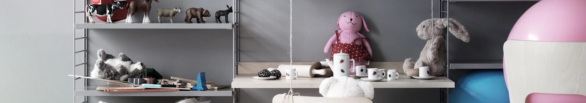 Å opprettholde ryddighet på et barnerom kan være en utfordring med leker, klær og kosedyr ofte spredt utover gulvet. Funksjonelle lagringsløsninger kan bidra til å unngå rot. String-hyllesystemet, som spenner fra den kompakte String Pocket til komplette hyllesystemer, gir en tilpasningsdyktig løsning for et ryddig rom. String-systemet kan utvides eller reduseres for å møte skiftende lagringsbehov, noe som gjør det enkelt å tilpasse for alle behov.