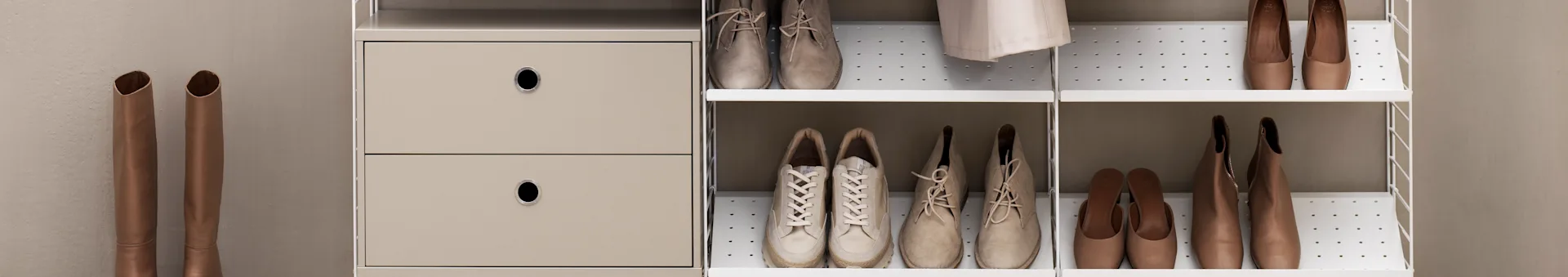 Det er en uslåelig følelse å trå inn i en velorganisert gang hvor alle klærne er pent ordnet. Dette gjelder både for deg og gjestene dine. Gangen er det første rommet du møter når du kommer hjem, og det første området gjestene dine ser når de besøker. La String-hyllens mangfoldighet inspirere deg til å skape tilpasset oppbevaring i gangen for å møte dine behov. String hylle tilbyr tallrike muligheter, enten du trenger oppbevaring for flere sko, ulike tilbehør som hansker og solbriller, eller rikelig plass for yttertøy som jakker og kåper.