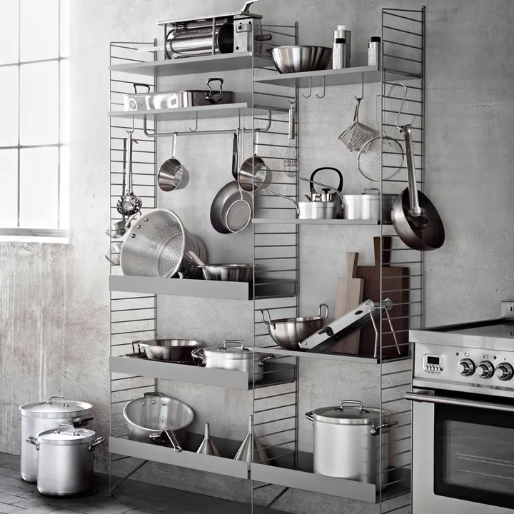 String metallhylle er laget av lakkert metall og har en perforert overflate som gjør den spesielt egnet til utendørsbruk eller til oppbevaring av kjøkkenutstyr. De perforerte hyllene er det optimale utgangspunktet for å være kreativ med tilbehøret vårt. Legg til kroker, stenger eller knagger for å designe din egen unike hylle. Metallhyllene fås i to bredder, 58 og 78 cm, og to dybder, 20 og 30 cm. Du kan også velge mellom lav eller høy kant.
