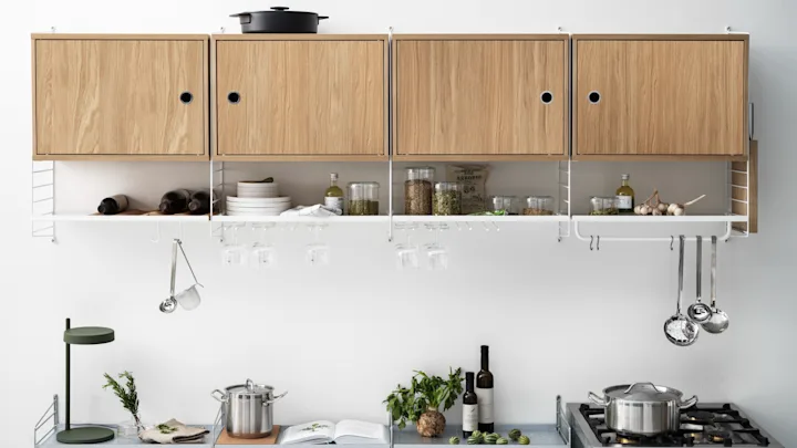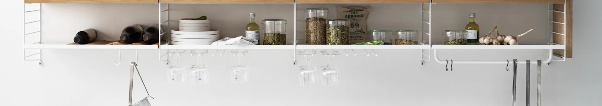 Oppdag praktiske og smarte funksjoner for din kjøkkenlagring med én eller flere String-hyller. String hylle lar deg kombinere ditt eget tilpassede designlagringsmøbel for kjøkkenet. Her kan du velge skuffer for oppbevaring av ting som servietter eller håndklær. Skap gjør det mulig å oppbevare matvarer, og String vitrineskap med glassdører gir vakker oppbevaring for glass og vaser. Med String-systemet på kjøkkenet kan du også skape praktiske lagringsløsninger som hjelper deg med å holde orden på mindre kjøkkenredskaper, som bestikk og kniver.