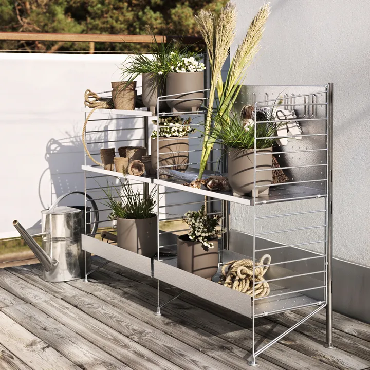 String Outdoor Frittstående stolpe fra String tilbyr en robust løsning for å bygge en utendørshylle. Laget av galvanisert stål, er denne stolpen en del av en modulær hyllekombinasjon. For en komplett seksjon, kombiner med en bakplate og to gulvgavler med høyde 85 cm og dybde 30 cm. Ved utvidelse av hyllen, legg til en ekstra stolpe og gavel per ny seksjon. Perfekt for fleksibel utemøblering.