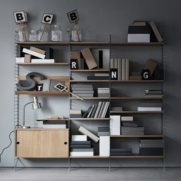 String skap med skyvedører passer til alle gavler fra String System og String Plex hvis gavlene har en dybde på 30 cm. Få ekstra oppbevaringsplass med dette stilrene skapet. Skapet ble designet av Nisse og Kajsa Strinning i 1949.