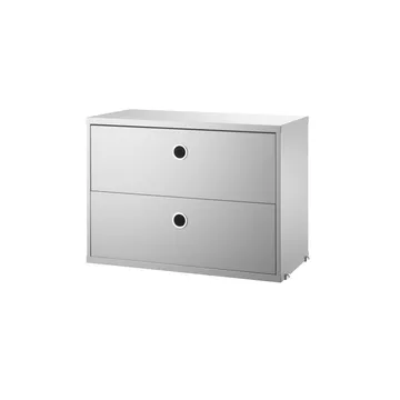 String skuffeseksjon er en del av den funksjonelle og klassiske String-hyllen og inngår i String System-serien som omfatter komponenter med klassiske trådpaneler og tilbyr nesten ubegrensede kombinasjonsmuligheter. Den har to skuffer med samme runde håndtak som skapdørene. String skuffeseksjon passer til alle String System-gavler i metalltråd og plex med en dybde på 30 cm.