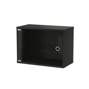 String vitrineskap 58 cm har skyvedører i glass, aluminiumshåndtak og hyller i herdet glass. Det passer til String sidegavel med 30 cm dybde og kan henges direkte på gavlene.