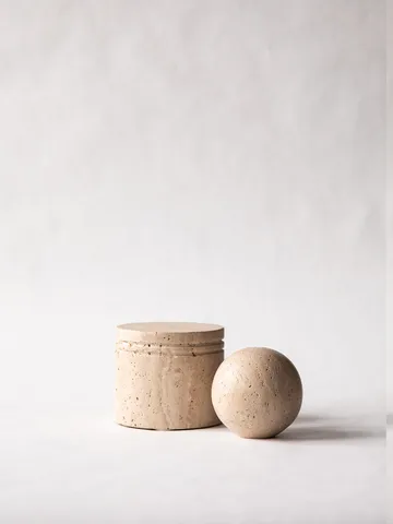 Travertine boks med lokk fra Tell Me More er en vakker og solid oppbevaringsboks i natursteinen travertin. Den tidløse formen gjør boksen like vakker på baderomshyllen som som dekorativ oppbevaring på salongbordet eller kommoden. Hver boks får unik karakter fordi materialet er brutt fra ulike deler av kalksteinen — små variasjoner i mønster og overflate gir sjarm og personlighet. Bruk den alene eller sammen med andre gjenstander fra Travertinserien for en harmonisk, naturlig følelse i hjemmet.