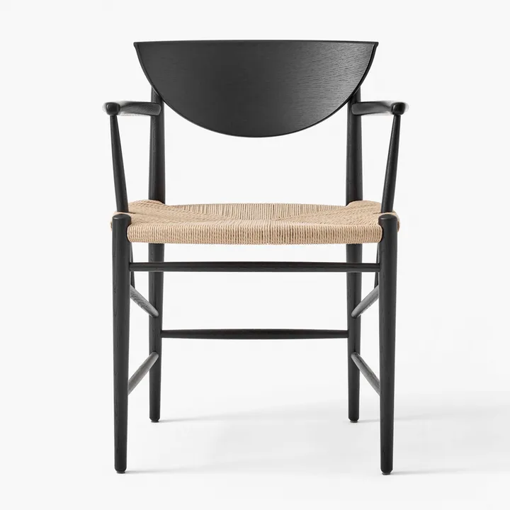 Drawn stol HM4 med armstøtte fra &Tradition ble tegnet i 1956 av den danske designduoen Hvidt & Mølgaard og er en komfortabel spisestol med armlener. Stolens sete er håndvevd av 100 meter papirsnor, noe som gir god sittekomfort med litt fjæring. Den geometriske formen på ryggstøtten i kombinasjon med de skrå stagene gir stolen Drawn sitt karakteristiske utseende.