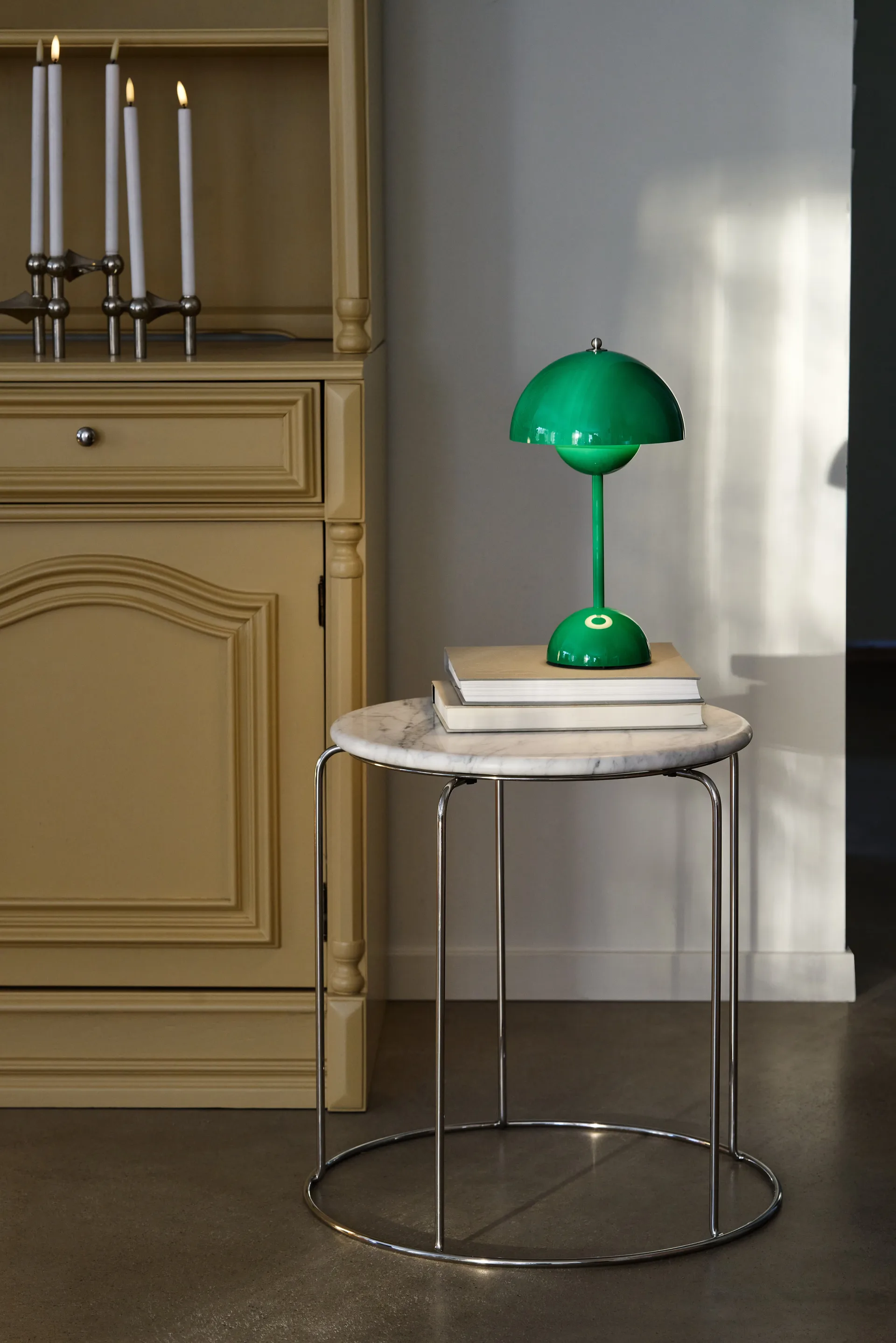 Flowerpot portable bordlampe VP9 fra &Tradition er en bærbar og dimbar bordlampe designet av Verner Panton. Inspirert av den klassiske VP3 tilbyr VP9 samme ikoniske avrundede silhuett i et noe mindre format, perfekt for å skape varm stemning både inne og ute. Den styres enkelt via en liten stålknopp på toppen og har tre dimnivåer for justerbart lys. Flowerpot Portable forener leken design og praktisk funksjon — et lettplassert og dekorativt innslag som løfter både balkong, uteplass og koselige kroker hjemme.