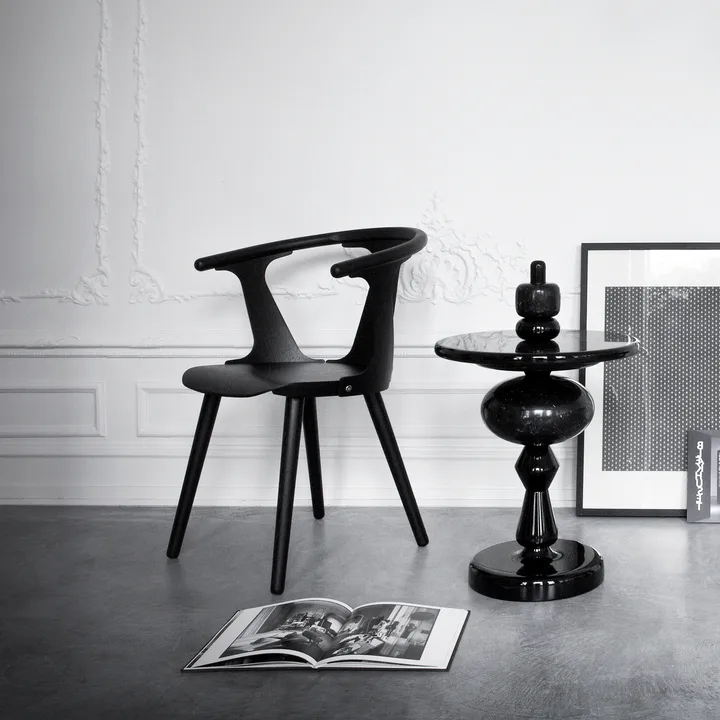 In Between stol SK1 fra &Tradition er designet av Sami Kallio, en finsk-svensk designer spesialisert på tre og tradisjonell trebearbeiding. Stolen kombinerer to klassiske teknikker: formpressing brukes for sete og ryggstøtte, mens dreiing former de runde beina og armlenet. Resultatet blir en elegant og komfortabel stol som passer hjemme ved spisebordet eller som en stilfull detalj i andre rom. Navnet In Between viser til de karakteristiske åpningene mellom ryggstøtten og sidepanelene.