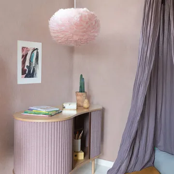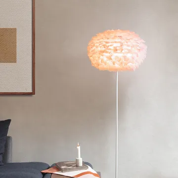 Eos lampe lyserosa fra Umage (tidligere Vita Copenhagen) gir med sine pastellrosa fjær et stemningsfullt skinn når den er tent og en varm følelse når den er slukket, noe som gjør den perfekt for soverom og barnerom. Lampeskjermen kan brukes enten som gulvlampe eller taklampe, avhengig av om du velger å bruke den med et stativ eller et lampeoppheng (kjøpes separat).