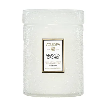 Japonica er et lite duftlys i en glasskrukke fra Voluspa. Det håndlagde duftlyset er laget av en ftalat-, paraben- og sulfatfri kokosvoksblanding. Glasskrukken med lokk har en vakker, relieffmønstret utside som gjør duftlyset til en dekorativ interiørdetalj samtidig som det sprer en behagelig duft i hjemmet.