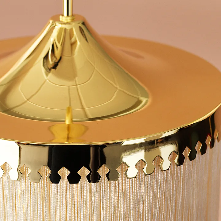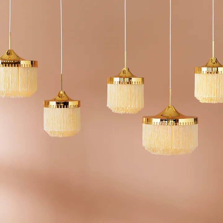 Fringe takpendel fra Warm Nordic er en elegant taklampe med dusker som gir rommet ditt karakter og sjarm. Dusklampen Fringe er en nytolkning av en lampe som opprinnelig ble designet av Hans-Agne Jakobsson på 60-tallet. Denne moderne versjonen har et litt mer minimalistisk design som fremhever kontrastene mellom den polerte metallen og de myke dusene.