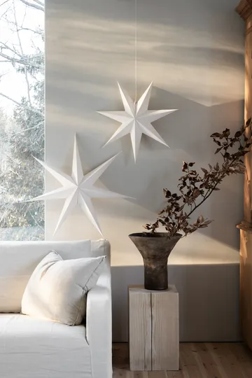 Aino slim julestjerne hvit fra Watt & Veke er en tidløs papirstjerne med elegant smal silhuett og myk lysstyrke. De små perforerte hullene sprer et varmt, stemningsfullt skjær som fyller rommet med ro og julestemning. Den hvite overflaten fanger lyset på en varsom måte og fremhever stjernens rene form, perfekt for å skape en stillferdig atmosfære i vinduet. Aino Slim fra Watt & Veke forener enkelhet og tradisjon i et design som skinner like vakkert år etter år.