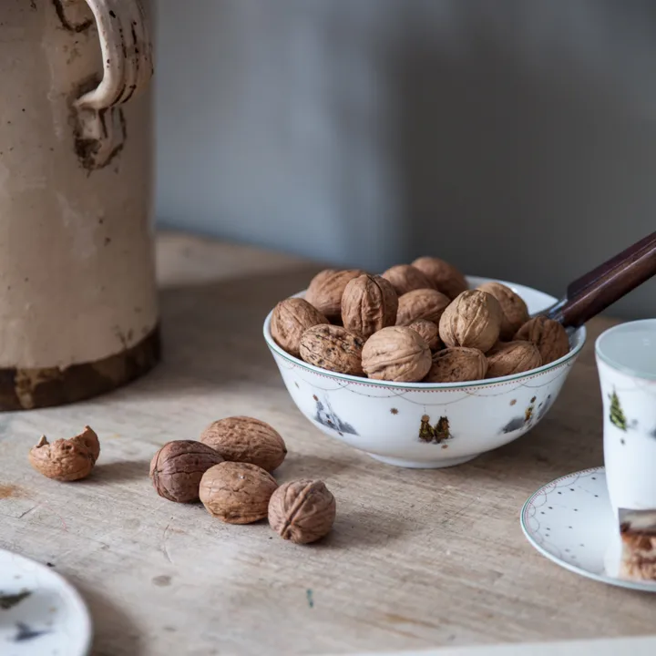 Skål i klassisk utforming i Julemorgen-serien fra norske Wik & Walsøe. Laget av tynt benhvit porselen og dekorert med omsorgsfult utvalgt motiv fra Linda Svedal Walsøes illustrasjoner Skålen i serien Julemorgen lykkes å balansere det moderne med det nostalgiske med sin form og dekor, noe som gjør den egnet til en rekke anledninger i løpet av julen.