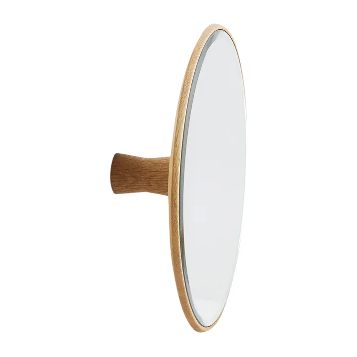 Barb speil stort fra danske Woud er designet av Martin Zanolin i massiv eik og førsteklasses glass for å tilby en både holdbar og minimalistisk detalj til hjemmet. Speilets runde form gir et mykt inntrykk, og den utstikkende delen på baksiden gjør at det enten kan festes på veggen eller lenes mot en bordplate. Speilet Barb er tilgjengelig også i en mindre størrelse, og sammen gir de et iøynefallende geometrisk uttrykk.