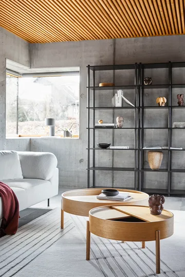Arc salongbord fra danske Woud er laget av tre i en myk rund form med tre ben, designet av Julie Begtrup og Ditte Vad. Bordet er både vakkert og funksjonelt, og under den roterbare bordplaten finner du et skjult oppbevaringsrom til småtingene som du vil ha i nærheten. Du kan også kombinere salongbordet Arc med sidebordet i samme serie for å sette sammen en vakker møbelgruppe.