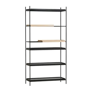 Tray hylle høy eik, 100 x 201 cm fra danske Woud er en åpen bokhylle med seks hylleplater i forskjellige størrelser, designet av Hanne Willmann. Den høye hyllen har en estetisk symmetri med rette linjer og er designet for å passe for nettopp deg. Velg selv din favorittkombinasjon ved å plassere platene på en av de ulike nivåene i rammen. Hyllen har små hylleplater som gjør det mulig å få plass til høye gjenstander, som en vakker vase.