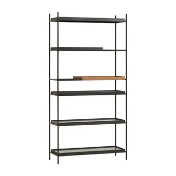Tray hylle høy valnøtt, 100 x 201 cm fra danske Woud er en åpen bokhylle med seks hylleplater i forskjellige størrelser, designet av Hanne Willmann. Den høye hyllen har en estetisk symmetri med rette linjer og er designet for å passe for nettopp deg. Velg selv din favorittkombinasjon ved å plassere platene på en av de ulike nivåene i rammen. Hyllen har små hylleplater som gjør det mulig å få plass til høye gjenstander, som en vakker vase.