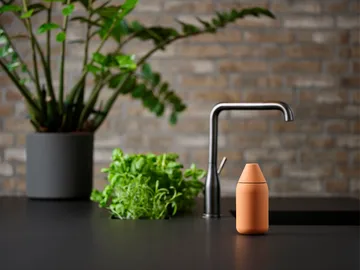 Singel såpedispenser fra Zone Denmark tilbyr en stilfull løsning for såpedosering ved kjøkkenvasken. Den rakettformede beholderen har en bred, sylinderformet bunn som står stabilt. Med et lett trykk doserer du enkelt såpe fra toppen. Laget av silkeaktig silikon er den enkel å tørke av, og påfylling skjer raskt ved å skru av toppen.