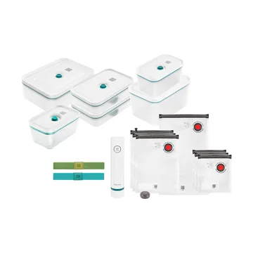 La-Mer vakuum startsett i plast fra Zwilling's Fresh & Save-serie garanterer at maten din holder seg friskere lenger. Med en trådløs vakuumpumpe, oppladbar via USB, og medfølgende BPA-frie beholdere i størrelsene S og M, samt fire gjenbrukbare poser, kan du enkelt bevare smak og næringsstoffer. Vakuumpumpen er enkel å bruke: plasser den på ventilen og trykk på knappen for å suge ut luften. Beholderne og posene tåler kjøling, frysing og mikrobølgeovn, med posene godkjent for sous vide opptil 100 °C.