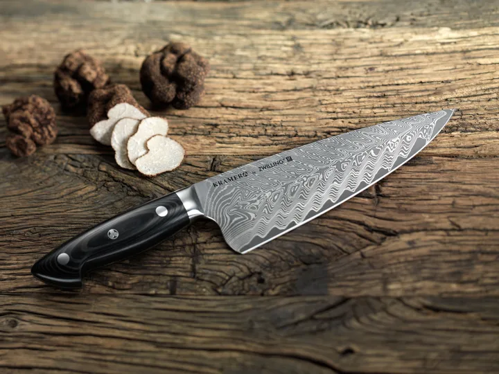 Zwilling Kramer euro stainless forskjærerkniv fra Zwilling x Bob Kramer tilbyr eksepsjonell skarphet og holdbarhet. Det lange bladet med Chevron-Damask-mønster er laget av ultrahardt pulverisert stål SG2 i 100 lag og har en hardhet på omtrent 63 Rockwell. Håndtaket i Micarta gir både sklisikkert grep og komfort. Perfekt for å skjære ulike typer kjøtt profesjonelt, samtidig som det ergonomiske håndtaket og den polerte eggen beskytter hendene. Inspirert av japansk tradisjon, er det en pålitelig kompanjong på kjøkkenet.