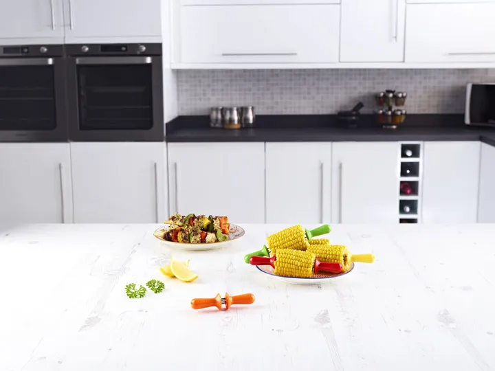 Zyliss maiskolbeholder 4-pk fra Zyliss er laget av holdbart ABS og rustfritt stål. Disse praktiske maiskolbeholderne låses sammen for sikker oppbevaring og enkel henting fra kjøkkenredskapskuffen. Perfekte for å holde maiskolbene stødig på plass under måltidet.