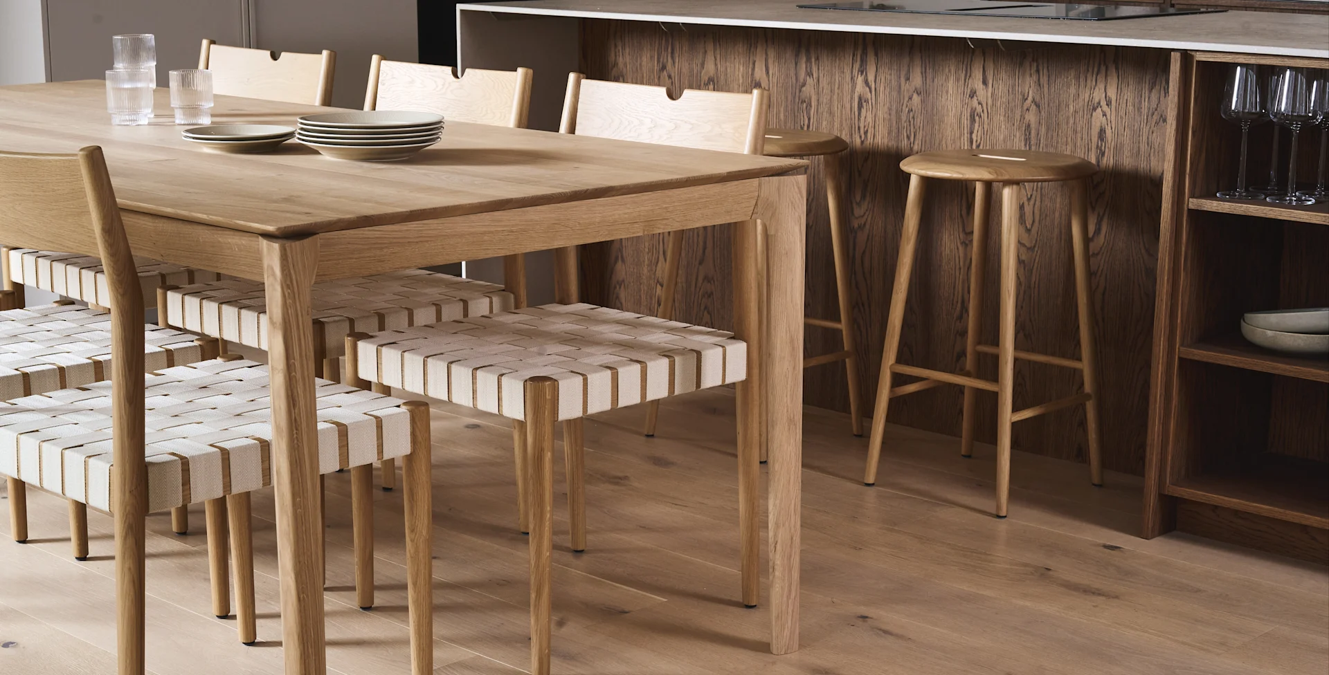 Har du en kjøkkenøy eller frokostbar som er litt høyere enn vanlige bord, er det perfekt å plassere barstoler her. Om du har et lite kjøkken, eller om du vil ha mer gulvplass på kjøkkenet, er veggstoler et perfekt valg.