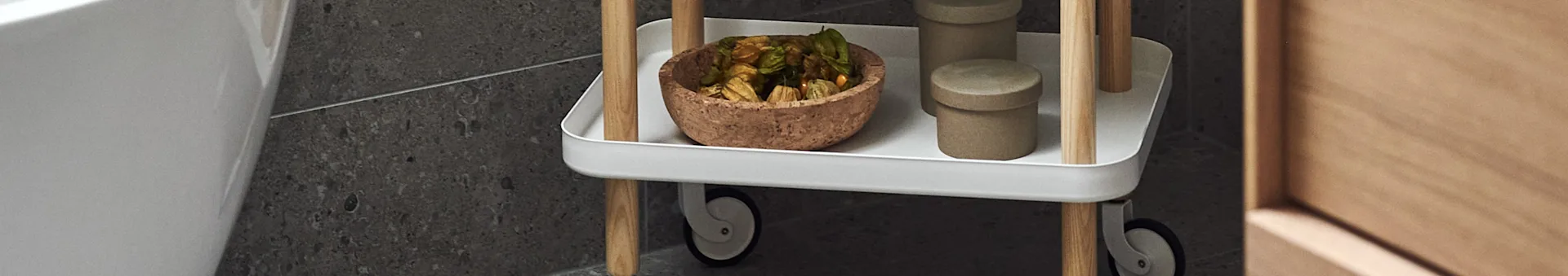 Trillebord er praktiske bord med hjul som lett kan plasseres der du har behov for litt ekstra oppbevaring, uansett om det er i gange, på barnerommet eller på kjøkkenet. En serveringsvogn er det perfekte tilbehøret ved spisebordet, og gjør det enkelt å servere herlige retter til gjestene dine, uten at serveringsskåler og serveringsfat tar opp plass på bordet. En barvogn med karafler og glass gjør hjemmebaren komplett, og hjelper deg skape den rette stemningen. Her hos Nordic Nest har vi et stort utvalg trillebord, serveringsvogner og barvogner fra kjente og populære merkevarer som House Doctor, Muuto og Normann Copenhagen.