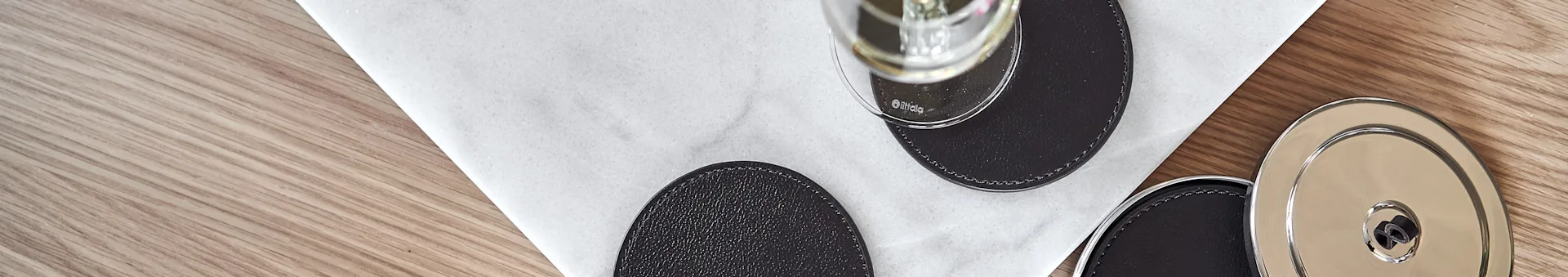 Både hos LIND DNA og aidas serie raw, finner du en rekke vakre glassunderlag i skinn. Disse er laget av resirkulert skinn, noe som gjør at dette også er et bærekraftig valg.